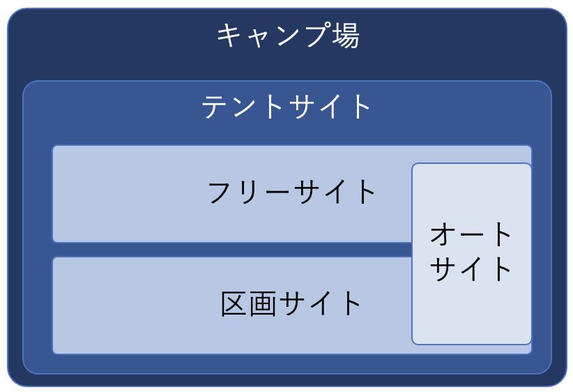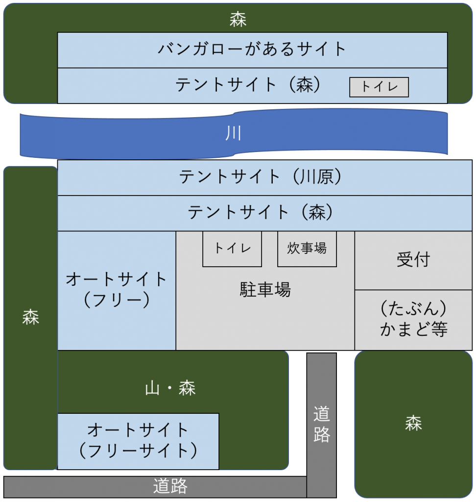 これももちろん、キャンプ場によってマチマチですが、大体以下の構造になります。